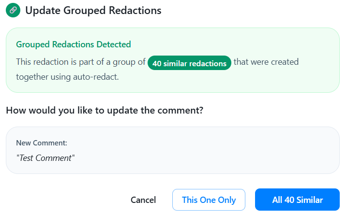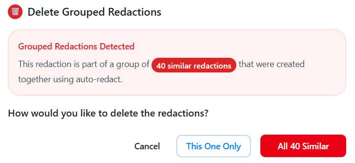 When you attempt to remove an auto-redaction, you will be asked if you want to remove just the one redaction or all of them.